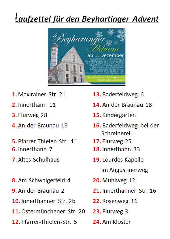 Flyer S.1Ein abendlicher Spaziergang durch den Ort, mit einem Licht in der Hand auf der Suche nach weihnachtlichen Motiven. Das können die Bürger heuer im Advent in Beyharting unternehmen. Die Aktion „Beyhartiger Advent“ bietet Raum und Zeit für Begegnungen mit Menschen und Orten im Dorf.